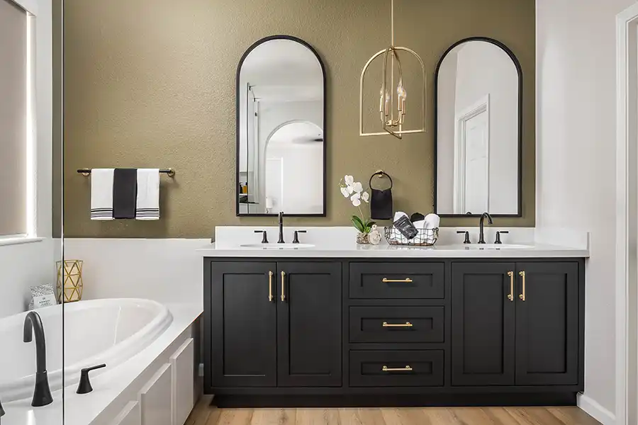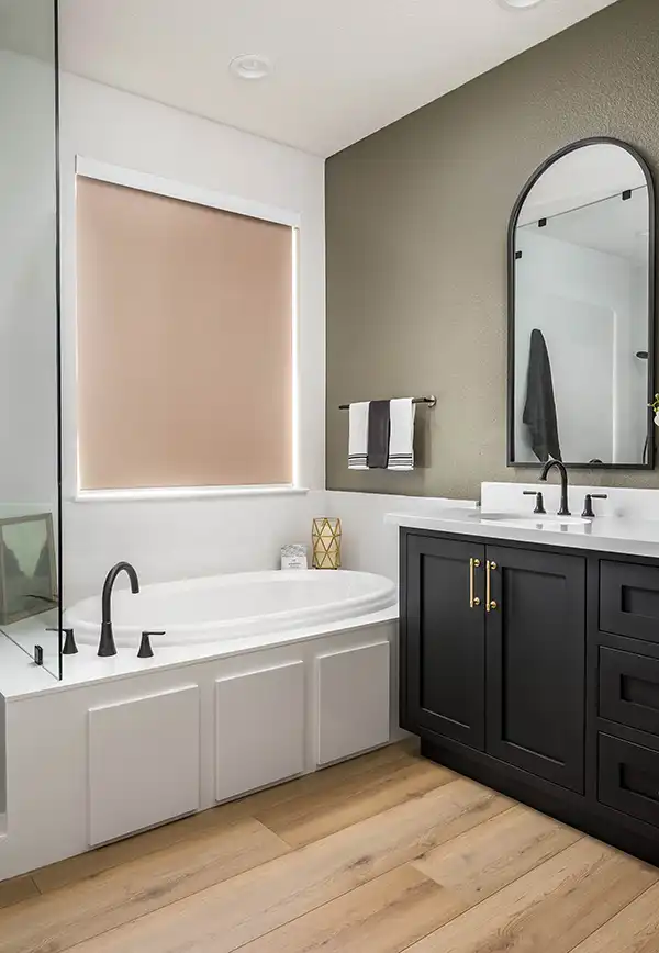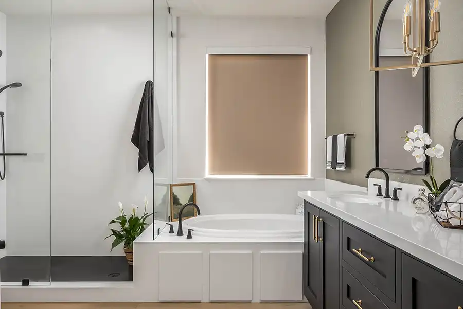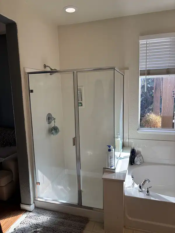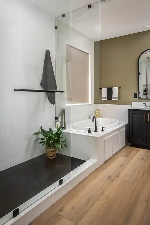 Scope: Anna and Justin outgrew their small shower and oddly shaped tub. They wanted a much larger shower and a bigger tub because their small daughter loves baths. We expanded the primary bathroom by enlarging the shower and tub areas into the bedroom, creating a more open and luxurious bathing space. The entry was redesigned with an arched opening that matches the tall arched vanity mirrors, giving the room a transitional yet timeless look. The shower was extended by three feet, finished in a solid surface marble material with a seamless black Corian shower floor, and included a recessed niche for a clean first impression. A thick, frameless glass panel system, treated with a water-spot-resistant finish, defines the shower and tub without a door. Dual showerheads — a prominent overhead fixture and a versatile handheld — were added, along with a built-in footrest and discreet access panels for convenience.