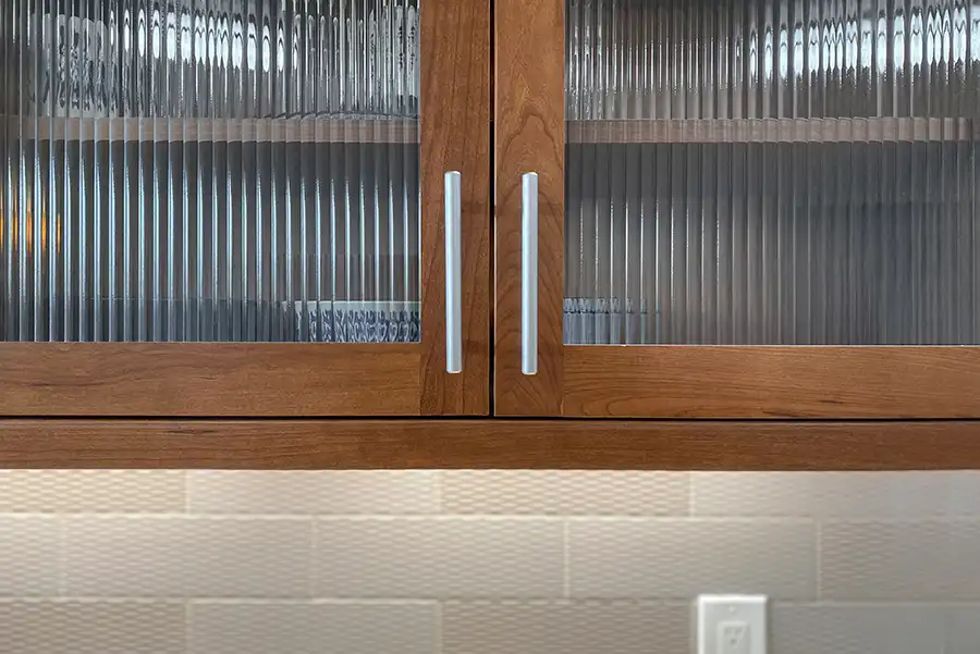- Glass-front upper cabinet doors, allowing light to pass through the space while creating an elegant display area for dishware and decorative items