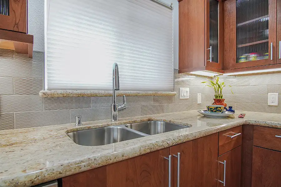 - Tile wrap at the kitchen window sill and jambs, continuing up to 18″ above the countertop for a cohesive, finished appearance